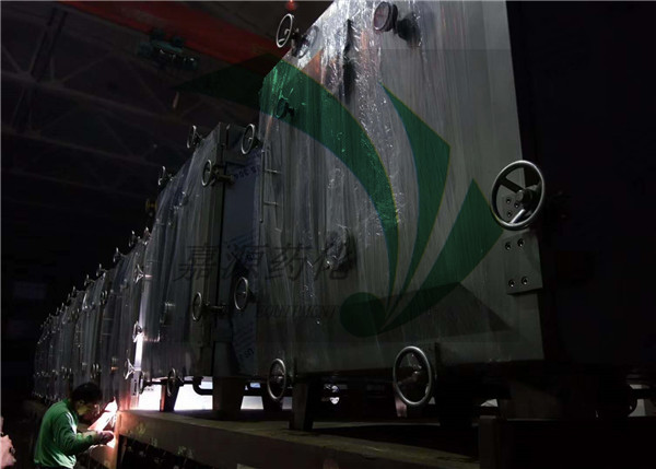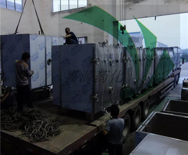江阴嘉源的这批设备,用于医药行业原料药的烘干,它的内部配备了加热管架、GMP烘盘。在真空状态下,由于沸点的降低,故能较快地完成物料的脱水干燥。